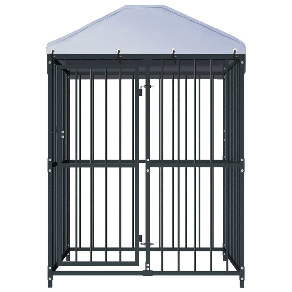 This large dog kennel provides ample exercise space while the steel bar walls help prevent mischief and unexpected accidents while enabling ventilation. Thanks to the sturdy and heavy-duty steel construction, this dog kennel is durable and built to last. The included fire-resistant and UV protected roof is made of 100% polyethylene and protects from the sun, rain, snow, and other harsh weather conditions. The hinged door has a lockable latch system which ensures extra security and safety for your dogs.