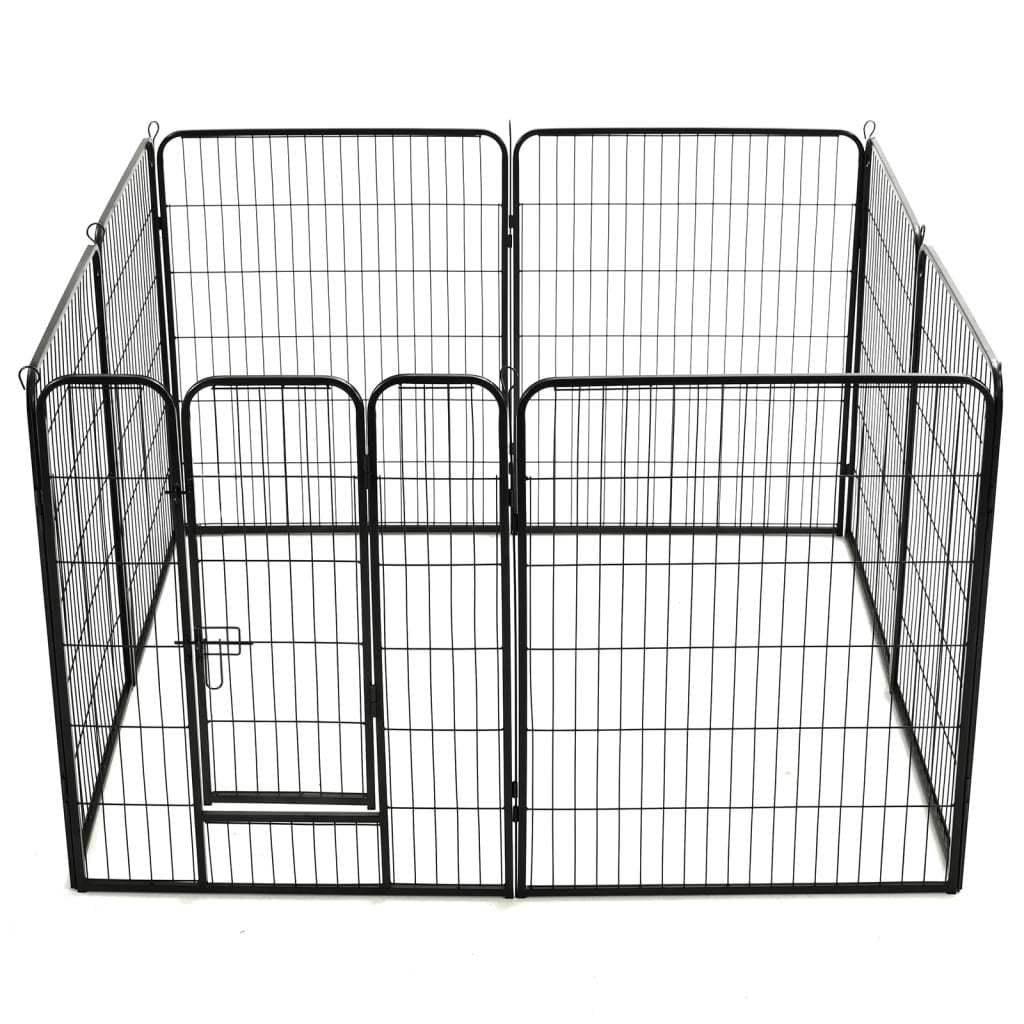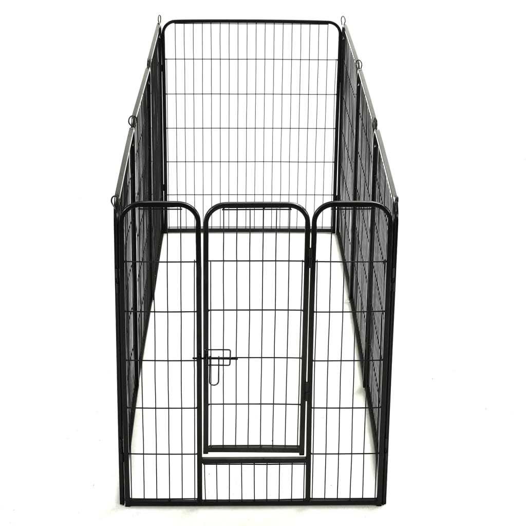 This dog kennel can be easily set up or taken down. It consists of 8 heavy-duty panels and each panel can be easily attached to the next, which allows you to configure the playpen in different shapes. The dog enclosure features a hinged door with security latches for easy access. This durable and weather-resistant dog playpen is made of rustproof powder-coated steel, making it suitable for outdoor and indoor use. The included ground stakes help secure the playpen outdoors for added stability and security.